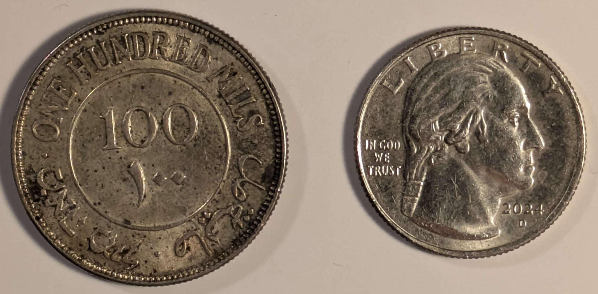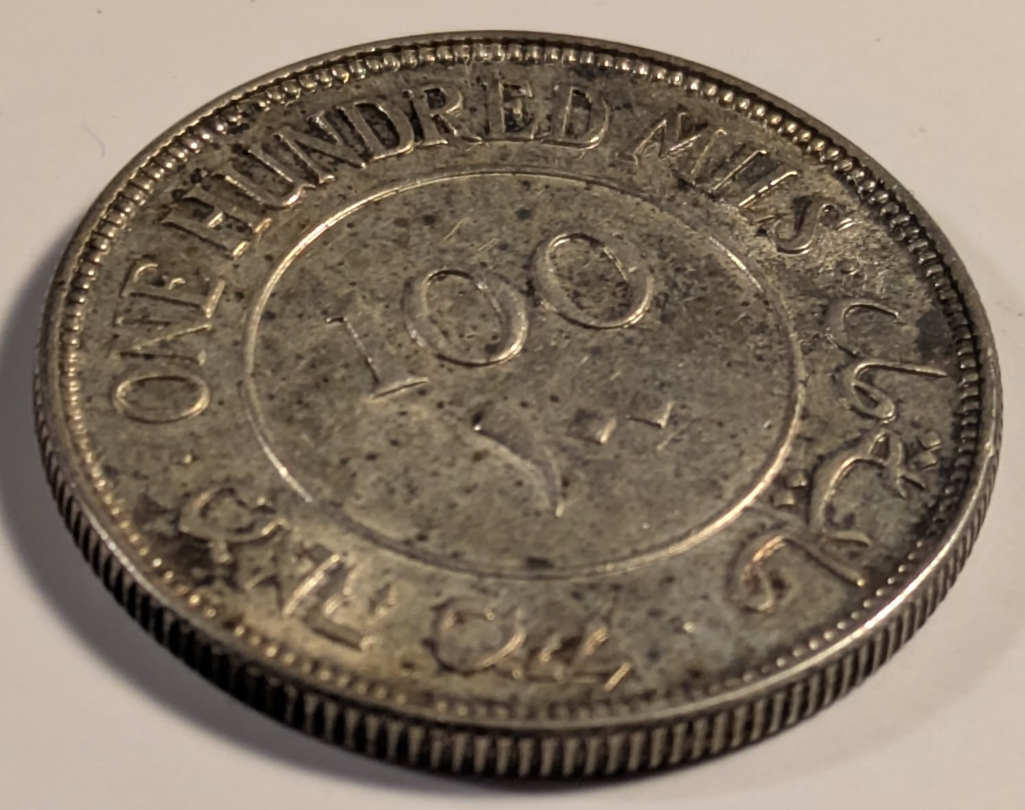 PALESTINE, British Mandate ~ 1933 ~ 100 Mils ~ Toned, somewhat spotted ~ Semi-key date ~ Y-7, KM-7 ~ AU