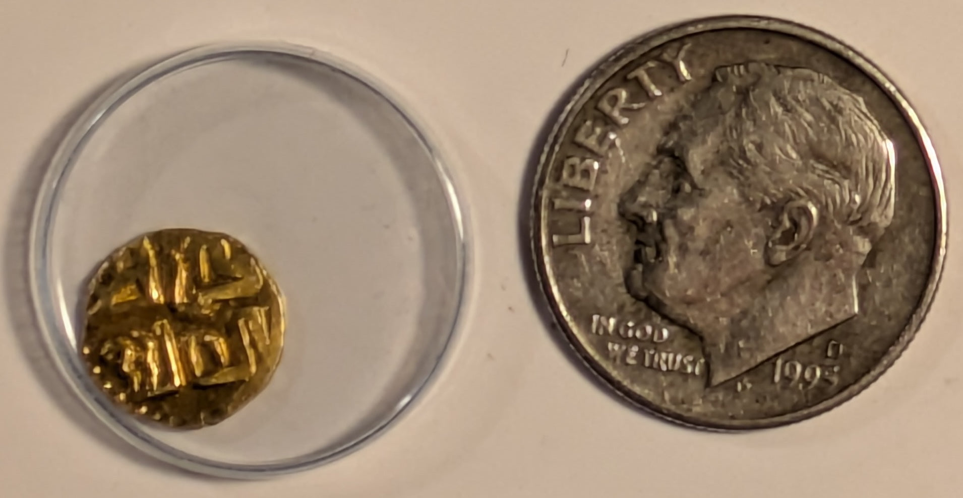 INDIA, Cholas of Tanjore. Raja Raja ~ 985-1014 ~ Gold Fanam (.44g) or 1/8 Kahavanu ~ Tiger seated right, bow behind, facing two upright fishes ~ 2 line legend, “Yuddha Malla”. Scarce ~ MNIS-726, Fr-286 ~ VF